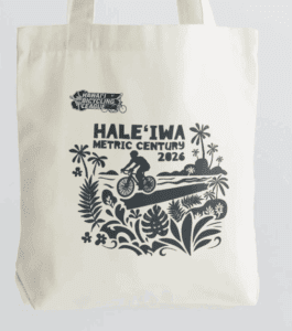 If you register before March 20th, you will receive a Hale‘iwa Metric Century dry-fit t-shirt or tote bag at registration. If you register late or on the day of the event, we may not have a t-shirt in your size or any tote bags left.