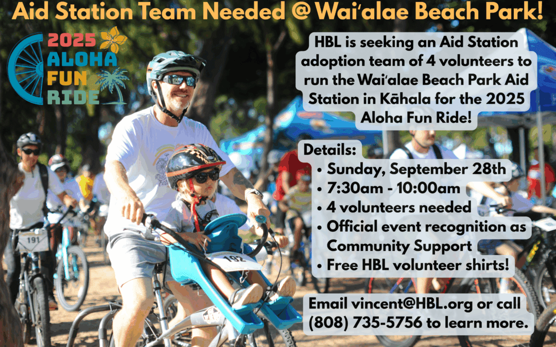 HBL is seeking an Aid Station adoption team of 4 volunteers to run the Waiʻalae Beach Park Aid Station in Kāhala for the 2025 Aloha Fun Ride!