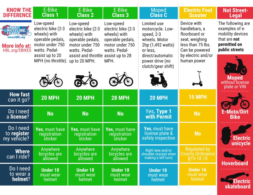 Many states have created “classes” of e-bikes that are subject to different regulations based on speed and other factors. In most states, including Hawai‘i, Class 1 & Class 2 e-bikes are regulated as traditional bicycles.